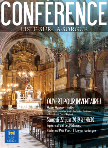 La Direction du patrimoine de l’Isle-sur-la-Sorgue organisera une conférence le samedi 22 juin 2019 à 14h,  sur le thème « Ouvert pour inventaire », par Maïna Masson-Lautier, conservatrice en chef au Service patrimoine, traditions et inventaire du Conseil régional.