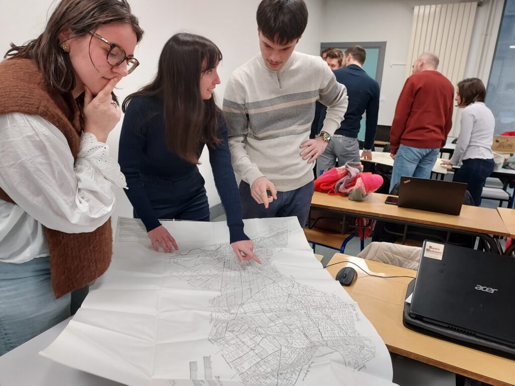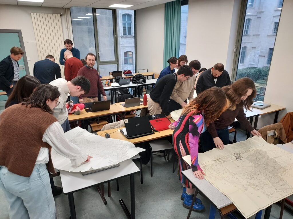 Au cours de la phase exploratoire du projet, démarrée en 2025, les étudiants du M2 Patrimoines et cultures numériques participent au peuplement de la base de donnée à partir des fonds cartographiques anciens numérisés et mis en ligne par les archives départementales (AD01, AD17, AD22, AD35, AD67, AD72, AD77, AD78). Des stages sur site d’un mois, permettant la consultation des plans originaux, sont également proposés aux M1 Patrimoines dès 2026.